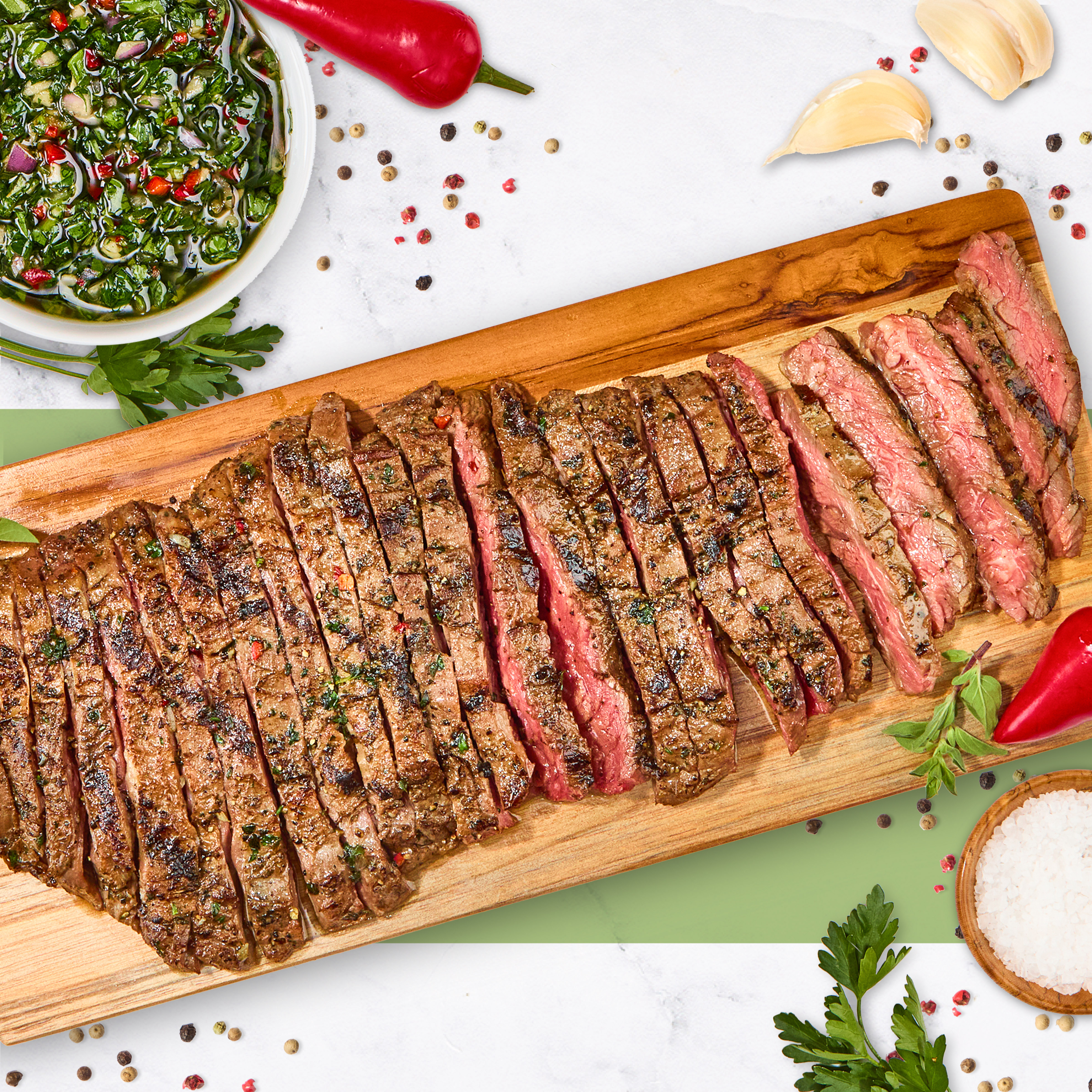 Our ChimiChurri Skirt steak is cut from the plate and is sought after for its natural beefy flavor. This section of beef is long and flat, with marbling throughout. The best way to cook this cut is hot and fast on a grill or in a pan. We flavored our skirt steak with Chimichurri seasoning for an authentic, full-bodied flavor, saving you prep to get dinner on the table faster! Sliced thinly against the grain, our skirt steak makes the perfect fajitas. Pair this fantastic cut of beef with grilled vegetables and rice for the full experience.